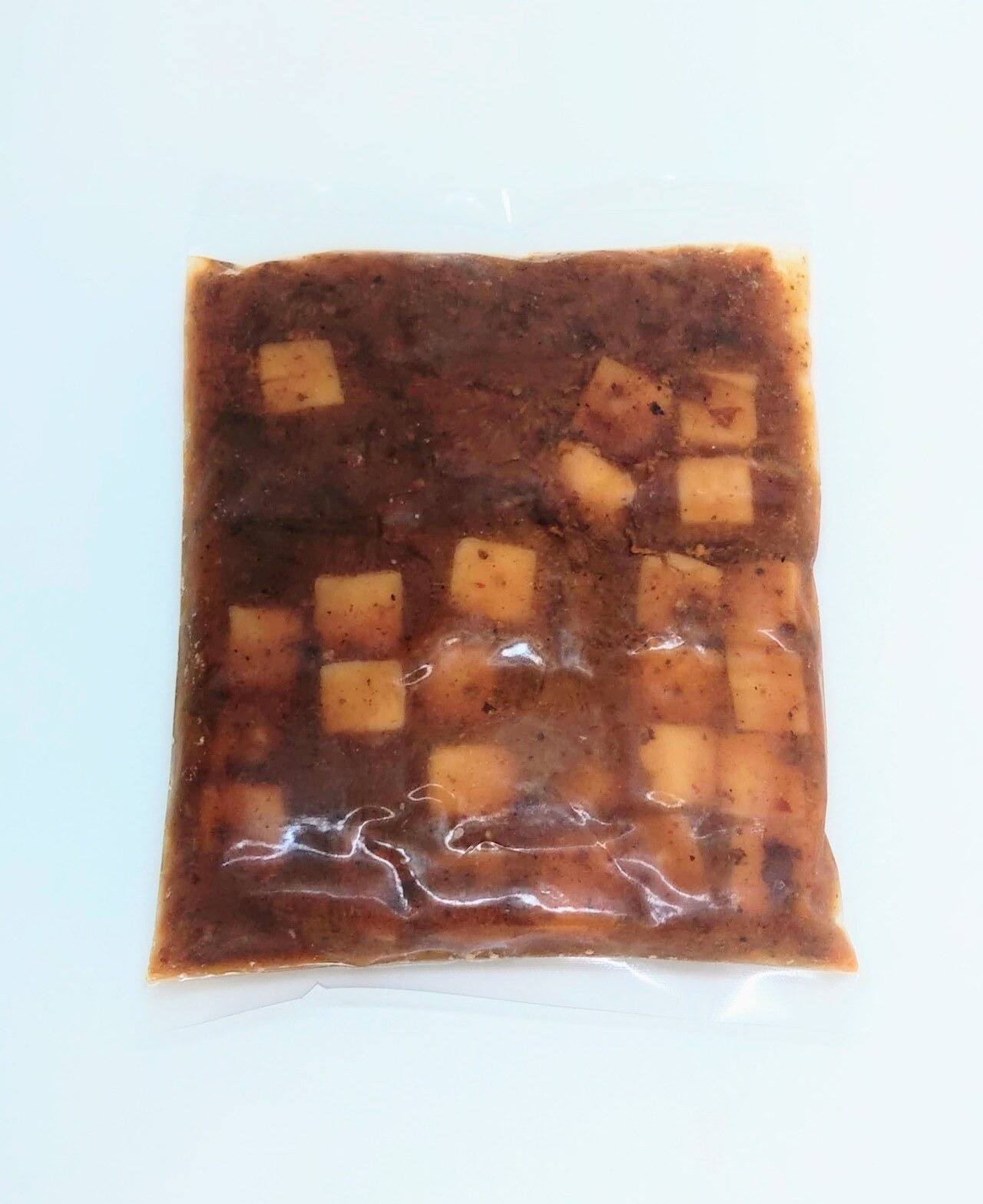 原材料名:冷凍豆腐(国内製造)、大豆たん白、食用調合油、しょうゆ、豚肉、馬鈴しょでん粉、中国醤油、味噌加工品、唐辛子、ニンニク、豆鼓、豆板醤、ガラスープの素、花椒、砂糖、中華用調味料/増粘剤(加工澱粉)、安定剤(加工澱粉)、調味料(アミノ酸等)、カラメル色素、凝固剤、酒精、甘味料(カンゾウ)、酸味料、pH調整剤、(一部に乳成分・小麦・大豆・牛肉・鶏肉・豚肉・ゼラチンを含む)